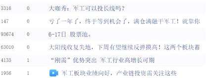 久違的強(qiáng)勢行情激發(fā)了投資者對軍工概念的討論熱情。梳理發(fā)現(xiàn),近幾日,股民對軍工概念的看多言論明顯增多,一些股民強(qiáng)調(diào)“方向?qū)α撕苤匾?,還有一些被軍工股深套的股民激動地喊出“虧了一年了,終于等到機(jī)會了,滿倉干軍工”的口號。