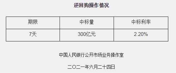 6月24日,央行開展了300億元逆回購操作,當(dāng)日有100億元逆回購到期,實現(xiàn)凈投放200億元。