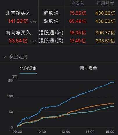 數(shù)據(jù)顯示,北向資金凈流入A股141. 03億元。兩市連續(xù)第六個(gè)交易日成交額破萬(wàn)億元,為10546億元。