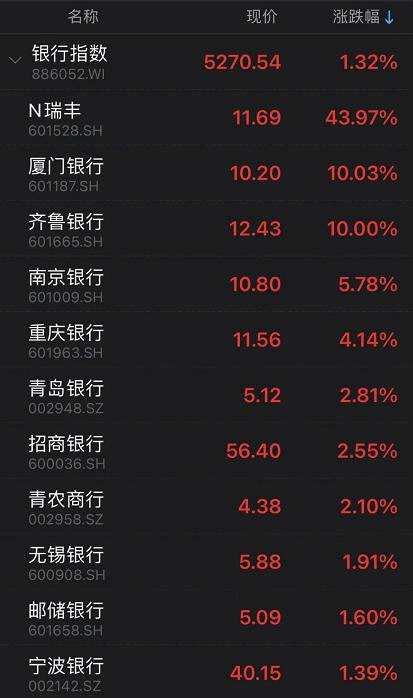 銀行板塊中,廈門(mén)銀行(601187)、齊魯銀行(601665)漲停,南京銀行漲超5%。