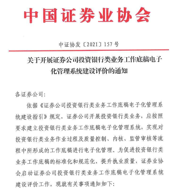2020年2月28日,中國(guó)證券業(yè)協(xié)會(huì)正式發(fā)布實(shí)施《建設(shè)指引》,要求證券公司開展投資銀行類業(yè)務(wù),應(yīng)按照指引要求建立底稿系統(tǒng),實(shí)現(xiàn)對(duì)投資銀行類業(yè)務(wù)項(xiàng)目立項(xiàng)、盡職調(diào)查、發(fā)行承銷、后續(xù)管理(包括持續(xù)督導(dǎo)、受托管理、存續(xù)期管理)等作業(yè)過(guò)程及質(zhì)量控制、內(nèi)核、監(jiān)管審核等流程中所形成的工作底稿進(jìn)行電子化管理。