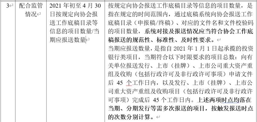 當(dāng)期應(yīng)報(bào)送數(shù)量,是指自2021年1月1日起承攬的投資銀行類項(xiàng)目,當(dāng)期符合以下時(shí)限要求的項(xiàng)目總數(shù):向有關(guān)單位報(bào)送發(fā)行、上市(掛牌)、上市公司重大資產(chǎn)重組及收購(gòu)(包括行政許可及非行政許可事項(xiàng))申請(qǐng)文件后45個(gè)工作日內(nèi),以及發(fā)行、上市(掛牌)、上市公司重大資產(chǎn)重組及收購(gòu)項(xiàng)目(包括行政許可及非行政許可事項(xiàng))完成后45個(gè)工作日內(nèi)。上述兩項(xiàng)時(shí)點(diǎn)均落在當(dāng)期、分期發(fā)行等需多次報(bào)送的項(xiàng)目,按觸發(fā)報(bào)送時(shí)點(diǎn)的次數(shù)分別計(jì)算。