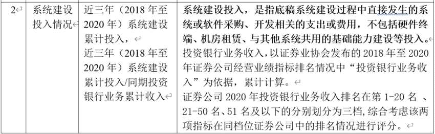 ?。?)“系統(tǒng)建設(shè)投入情況”=近三年(2018年至2020年)系統(tǒng)建設(shè)累計(jì)投入/同期投資銀行業(yè)務(wù)累計(jì)收入,該項(xiàng)總分20分。