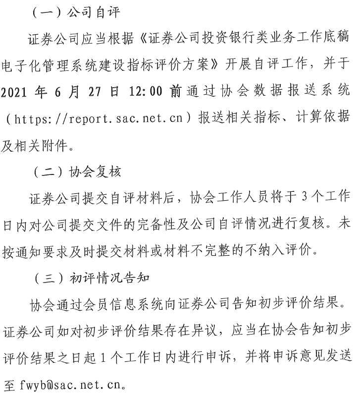 記者獨(dú)家獲悉,中國(guó)證券業(yè)協(xié)會(huì)6月25日下午向券商緊急下發(fā)了《關(guān)于開展證券公司投資銀行類業(yè)務(wù)工作底稿電子化管理系統(tǒng)建設(shè)指標(biāo)評(píng)價(jià)的通知》(下稱《通知》),同時(shí)下發(fā)了評(píng)價(jià)方案,券商需在6月27日(周日)中午12:00前提交自評(píng)材料。