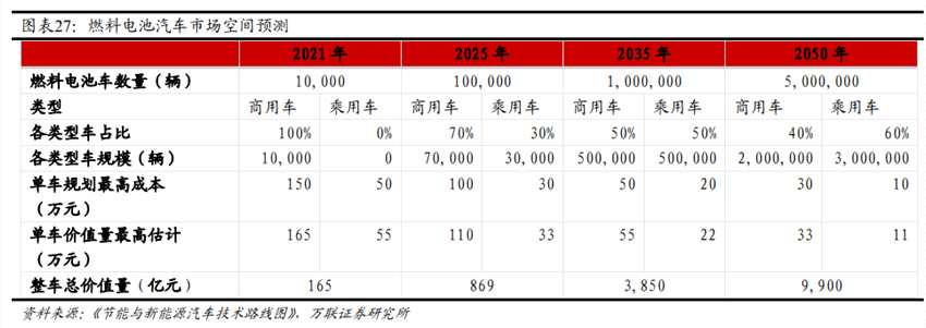 但氫燃料電池汽車產銷數據的增長潛力有望在下半年爆發(fā),因為氫燃料電池全產業(yè)鏈一般在第一、二季度與下游廠商商討技術方案、制定商務合同、訂單備貨,第三季度采購生產第四季度確認交付。萬聯證券分析師測算,到2050年,燃料電池汽車規(guī)模將達到9900億元。