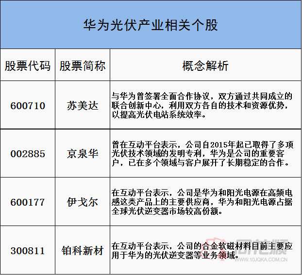 華為作為智能光伏領(lǐng)域的先行者,目前多個產(chǎn)品已業(yè)界領(lǐng)先,智能光伏逆變器全球市場份額第一,面向商業(yè)領(lǐng)域推出智能光伏控制器、逆變器,面向民用領(lǐng)域推出智能光伏逆變器、智能通信棒、智能光伏管理系統(tǒng)。在光伏領(lǐng)域與華為合作的公司或?qū)⑹芤妗?/p>