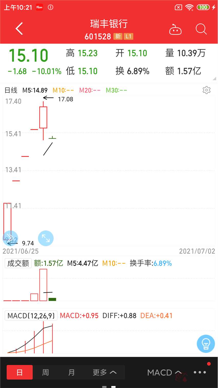 瑞豐銀行于6月25日上市,發(fā)行價(jià)格8.12元/股,開(kāi)盤后漲至11.69元/股,漲幅達(dá)43.97%。7月1日,瑞豐銀行上市以來(lái)首次打開(kāi)漲停板,當(dāng)日股價(jià)報(bào)收16.78元,漲幅7.77%,總市值達(dá)到253.27億元。