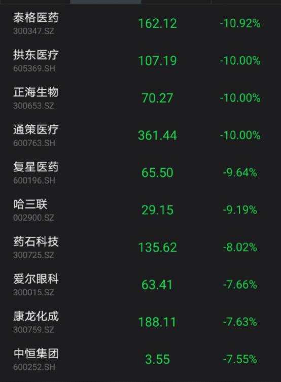 生物疫苗、CXO、醫(yī)美、眼科醫(yī)療、牙科醫(yī)療、中藥等板塊集體大跌,通策醫(yī)療(600763)、【奧園美谷(000615)、股吧】(000615)等多股跌停,愛博醫(yī)療、愛爾眼科(300015)、愛美客(300896)等多只醫(yī)藥個股全線走低。