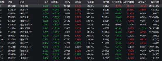 其中華寶中證醫(yī)療ETF下跌4.94%,國泰中證醫(yī)療ETF下跌4.72%,博時恒生醫(yī)療保健ETF下跌4.35%,天弘中證全指醫(yī)療保健設備與服務ETF、廣發(fā)中證創(chuàng)新藥產(chǎn)業(yè)ETF、平安中證醫(yī)藥及醫(yī)療器械創(chuàng)新ETF等跌超3%。