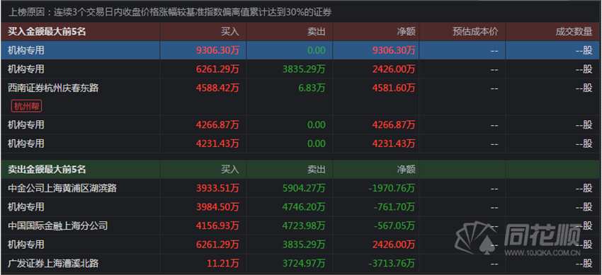 三日榜顯示四個(gè)機(jī)構(gòu)專用賬戶占據(jù)買入四個(gè)席位,杭州幫占據(jù)另一席位。兩機(jī)構(gòu)專用賬戶分別賣出4746.20萬元、3835.29萬元。