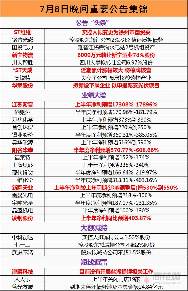 7月8日重點(diǎn)公告解讀:又有化工股業(yè)績大增達(dá)170多倍