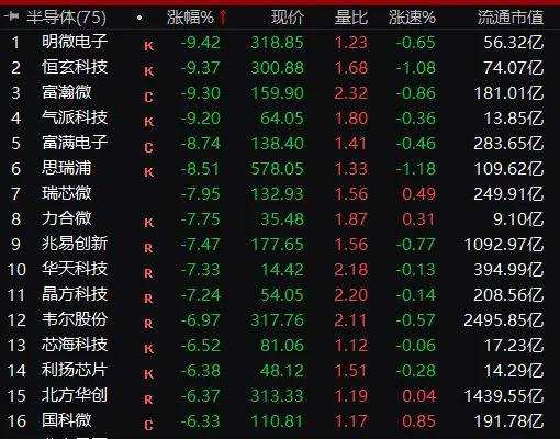 半導(dǎo)體芯片股暴跌4.66%,明微電子、恒玄科技、富瀚微(300613)、氣派科技跌超9%,遭大基金減持的【瑞芯微(603893)、股吧】(603893)跌近8%。