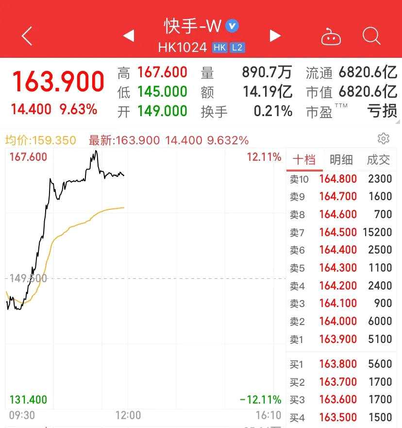 快手盤中大漲超10%