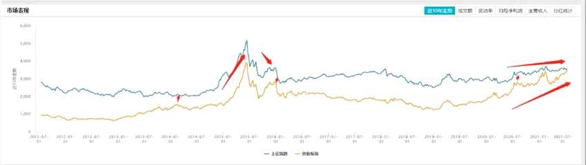 最近這次靠攏,在2018年底、2019年初,兩個指數(shù)又跌到個底部,創(chuàng)業(yè)板指數(shù)跌至1184點(diǎn)、上證指數(shù)跌至2240點(diǎn),由此開市起步,2年多的時間,如今兩大指數(shù)終于正式交匯了。