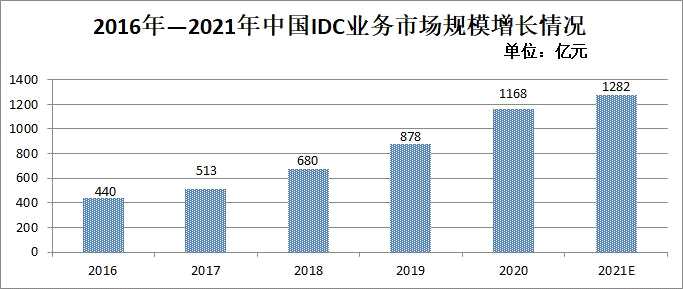 受新基建、網(wǎng)絡強國、數(shù)字經(jīng)濟等國家政策影響以及新一代信息技術發(fā)展的驅(qū)動,我國互聯(lián)網(wǎng)數(shù)據(jù)中心(IDC)業(yè)務市場規(guī)模保持高速增長。據(jù)信通院數(shù)據(jù)顯示,2016年,我國IDC業(yè)務市場規(guī)模為440億元,到2020年我國IDC業(yè)務市場規(guī)模達到1168億元,五年復合增長率約33.09%。機構預測未來仍將保持快速增長,預計2021年IDC業(yè)務市場規(guī)??蛇_1282億元。據(jù)中國IDC此前發(fā)布的報告預計,2022年,中國IDC業(yè)務市場規(guī)模將超過3200.5億元,同比增長28.8%。