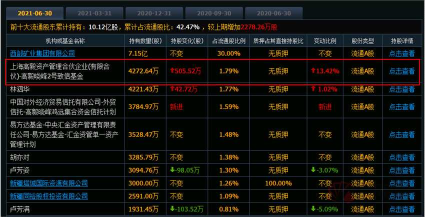 西部礦業(yè)的這份半年報也透露了私募大佬的持倉動向。根據(jù)財報,千億私募高毅資產(chǎn)鄧曉峰在二季度公司股價震蕩之際果然逆市加倉了,持股增至8057.61萬股,較一季度末翻倍,持股市值接近10個億。