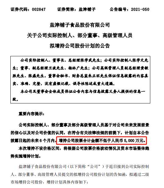 7月19日晚間,鹽津鋪子發(fā)布公告稱,公司實際控制人、部分董事及部分高級管理人員基于對公司未來發(fā)展前景的信心以及對公司價值的認同,計劃自公告披露日起的未來6個月內,增持公司股票合計金額不低于5000萬元。