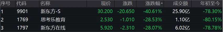 港股市場(chǎng),教育板塊下跌。其中,新東方放量跌逾40%,思考樂(lè)教育、新東方在線均跌超28%。