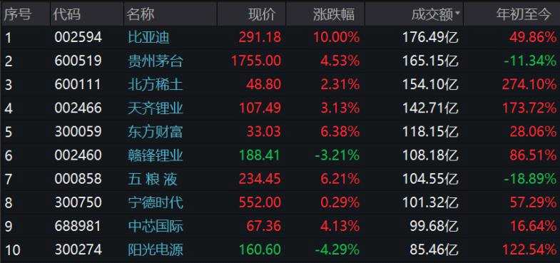 在八月份第一個交易日,市場普漲,成交量攀升。據(jù)《紅周刊》記者統(tǒng)計,截至8月2日收盤,滬深兩市成交額達到1.51萬億元,創(chuàng)下年內(nèi)次新高。其中,以貴州茅臺為代表的“茅指數(shù)”再次占據(jù)了較大權(quán)重。具體來看,比亞迪(002594)、貴州茅臺、東方財富(300059)、五糧液和寧德時代的成交額均突破百億,中芯國際和陽光電源(300274)等也均在80億元以上(見附圖)。