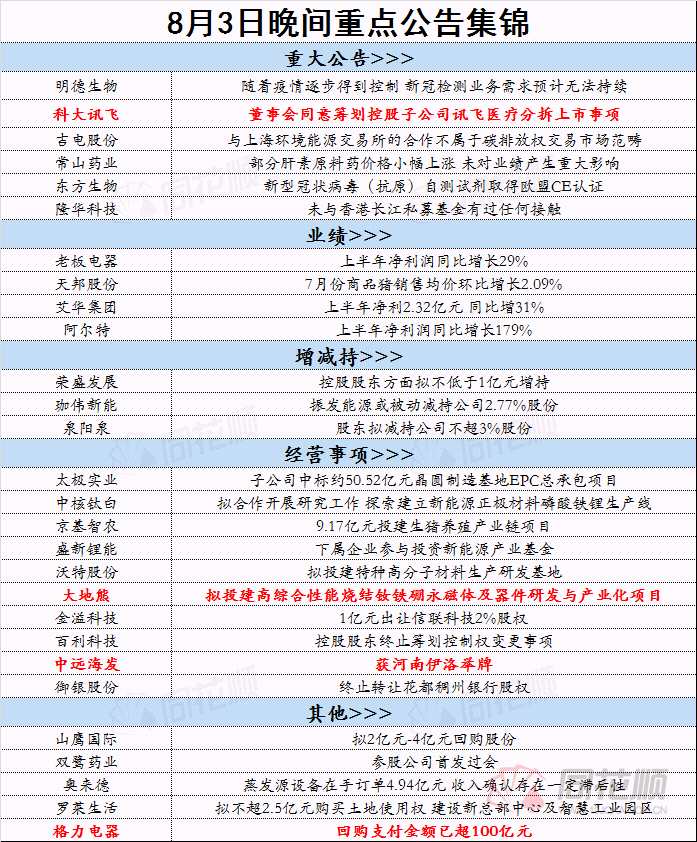 8月3日重點公告解讀:科大訊飛籌劃子公司分拆上市