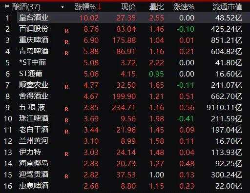 釀酒板塊中,皇臺(tái)酒業(yè)(000995)漲停,百潤股份(002568)大漲超8%。