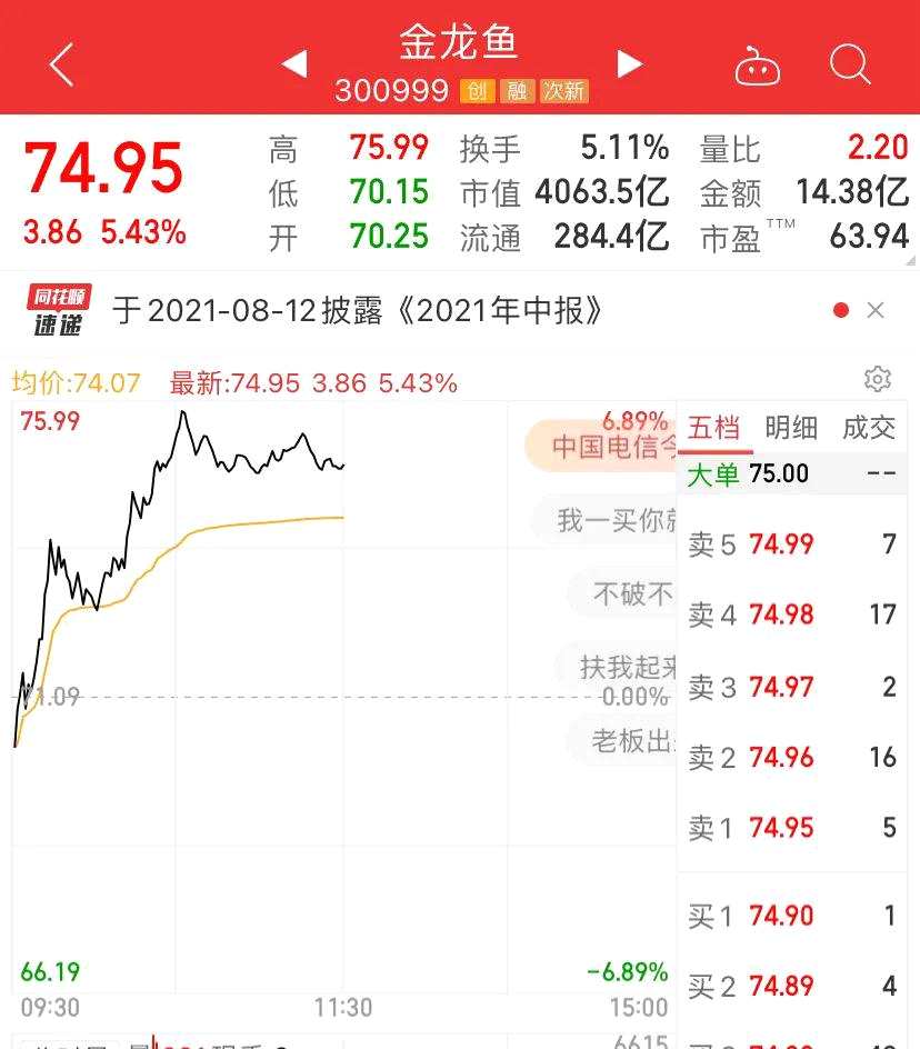 4000億市值的【金龍魚(300999)、股吧】(300999)大漲超5%。
