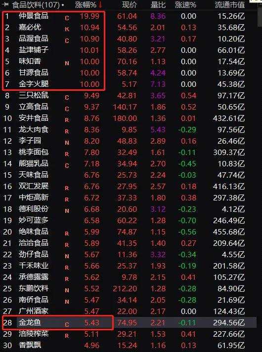 仲景食品(300908)20漲停,品喔食品、鹽津鋪?zhàn)樱?02847)、【甘源食品(002991)、股吧】(002991)等食品股掀起漲停潮。