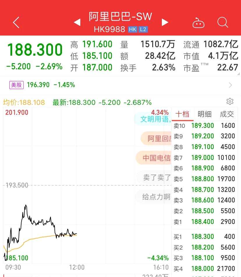 今日上午港股開盤,阿里巴巴股價(jià)低開跳水,一度跌超4%,盤中市值一度蒸發(fā)超1800億港元。