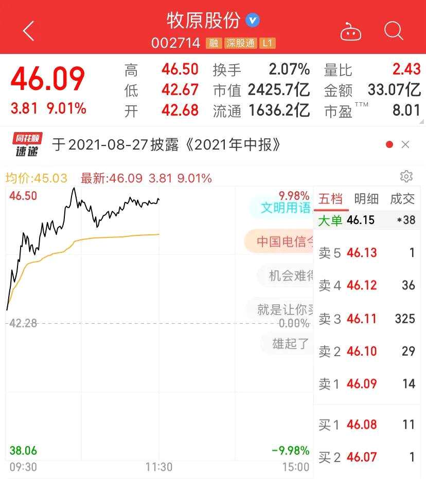 7月以來豬價(jià)有所提升,豬肉概念也暴漲,豬茅【牧原股份(002714)、股吧】(002714)股價(jià)大漲9.01%。