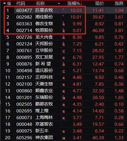 巨星農(nóng)牧(603477)、湘佳股份(002982)、【傲農(nóng)生物(603363)、股吧】(603363)漲停。