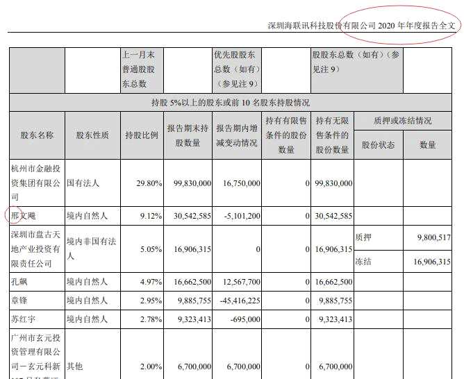 截止到2020年12月31日,邢文飚持有公司9.12%股份。據(jù)介紹,在 2020 年 5 月 26 日至 2021 年 8 月 4 日期間,持有海聯(lián)訊股份的比例從 10.64%降至 5.00%,持股比例變動達到 5.64%。其中,以集中競價方式累計減持 1.52%,以大宗交易方式累計減持4.12%。2021 年 7 月 7 日,你的持股比例累計變動達到 5%。你在持股比例累計變動達到 5%時,未停止買賣海聯(lián)訊股份并及時履行報告和公告義務(wù),直至 2021 年 8 月 6 日才披露《簡式權(quán)益變動報告書》。