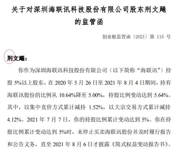 海聯(lián)訊二股東邢文飚減持超過5%未停止交易:收監(jiān)管函