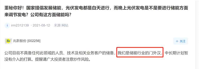 在回復(fù)投資者是否有儲能戰(zhàn)略布局時,兆新股份稱:“公司目前不具備任何此領(lǐng)域的人員、技術(shù)及相關(guān)業(yè)務(wù)客戶的儲備,我們是儲能行業(yè)的門外漢,中長期計劃暫沒有介入的打算。”