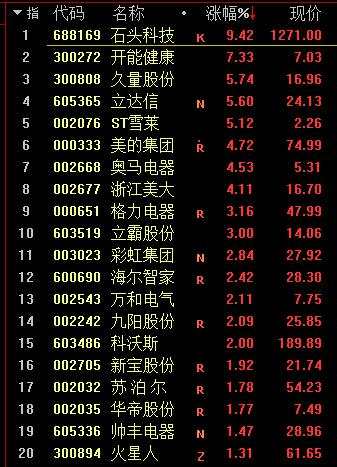 【石頭科技(688169)、股吧】漲超9%,美的集團(000333)漲超4%,海爾智家(600690)、格力電器(000651)等紛紛上漲。