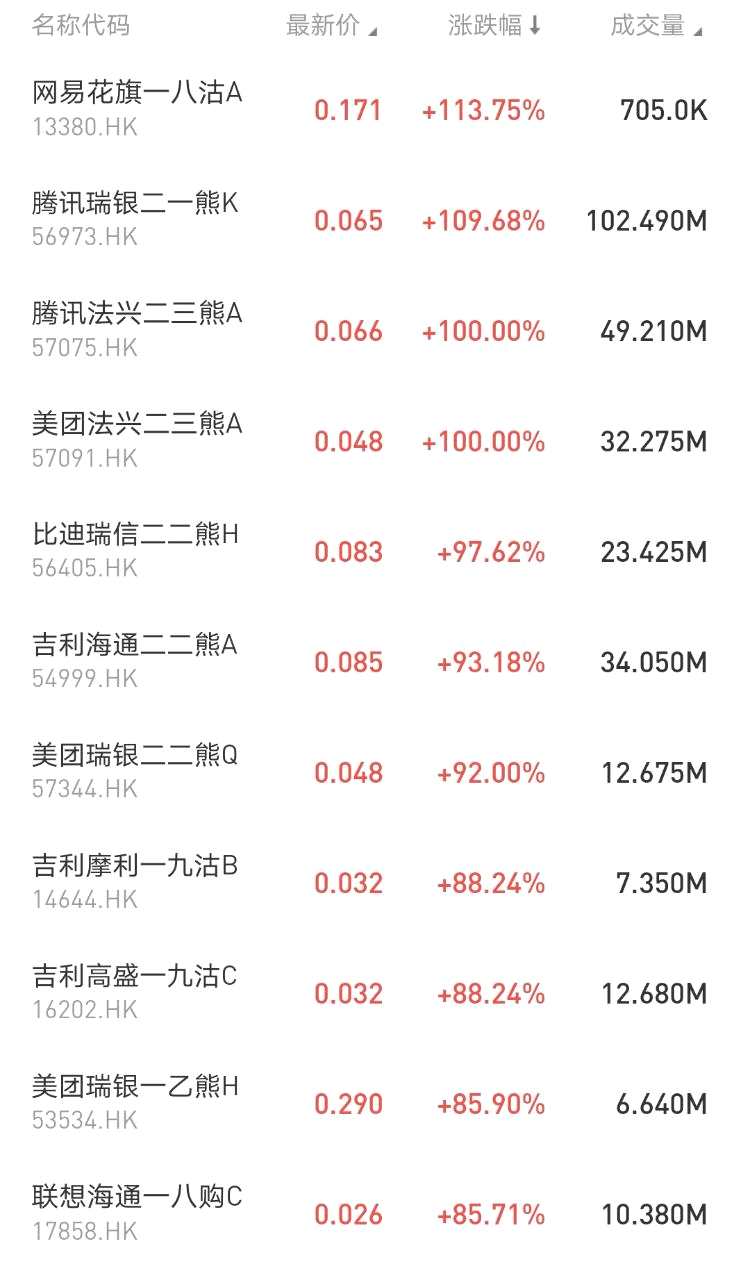 漲幅居前的包括: $13380.HK 網(wǎng)易花旗一八沽A大漲113.75%,占據(jù)排行榜第一; $56973.HK 騰訊瑞銀二一熊K漲109.68%; $57075.HK 騰訊法興二三熊A漲100%。