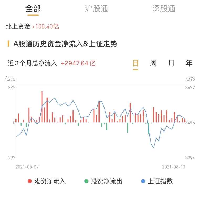 北上資金今日凈流入100.4億元,前一交易日凈流入26.78億元。