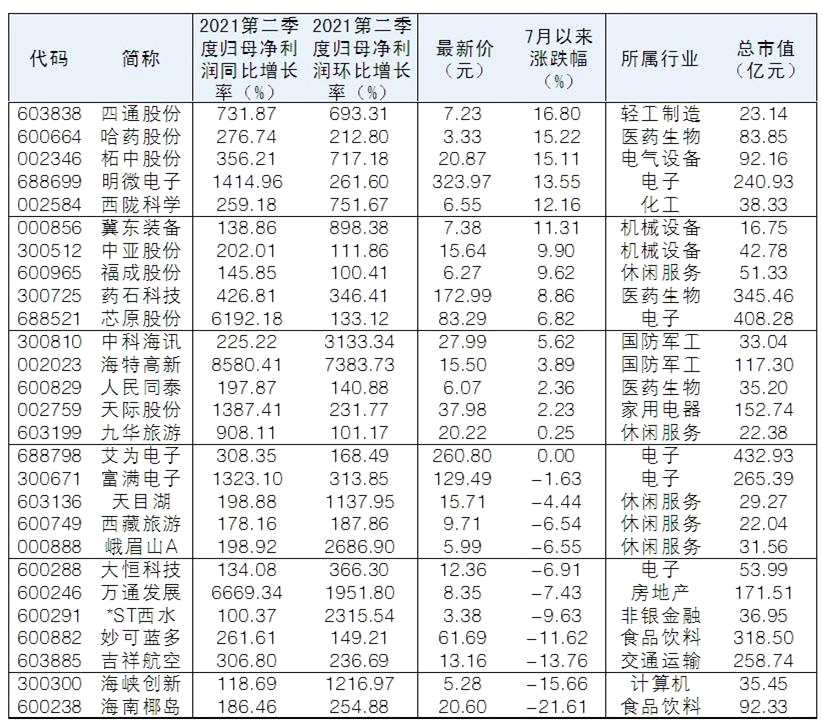 截至昨日,從已披露中報公司中篩選發(fā)現(xiàn)54家公司第二季度歸母凈利同比增速、環(huán)比增速均超100%。從分布來看,化工行業(yè)表現(xiàn)不俗。二級市場來看,這些雙增股中,天音控股(000829)、遠(yuǎn)興能源(000683)、精功科技(002006)、*ST德新(603032)等7月以來漲幅超過80%。