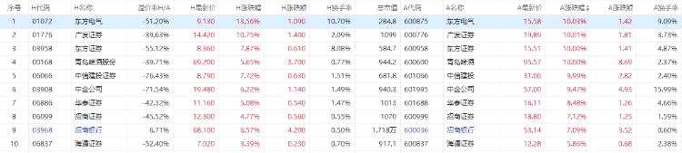 截至發(fā)稿,東方電氣(600875)A股收漲10.03%,H股漲13.56%;廣發(fā)證券A股收漲10.01%,H股漲10.75。洛陽鉬業(yè)(603993)A股收跌3.99%,H股跌1.46%。