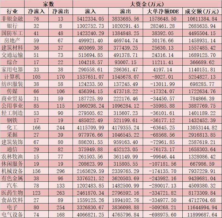 二、周三(8月18日)申萬(wàn)一級(jí)行業(yè)大單資金流向