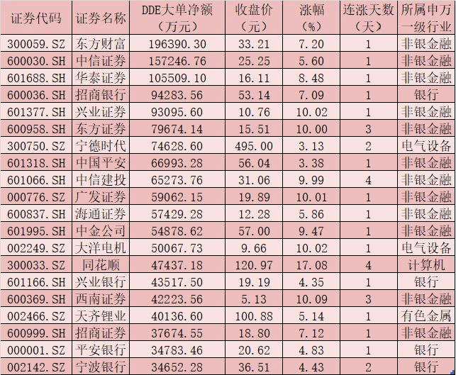 一、周三(8月18日)DDE大單資金凈買入TOP20
