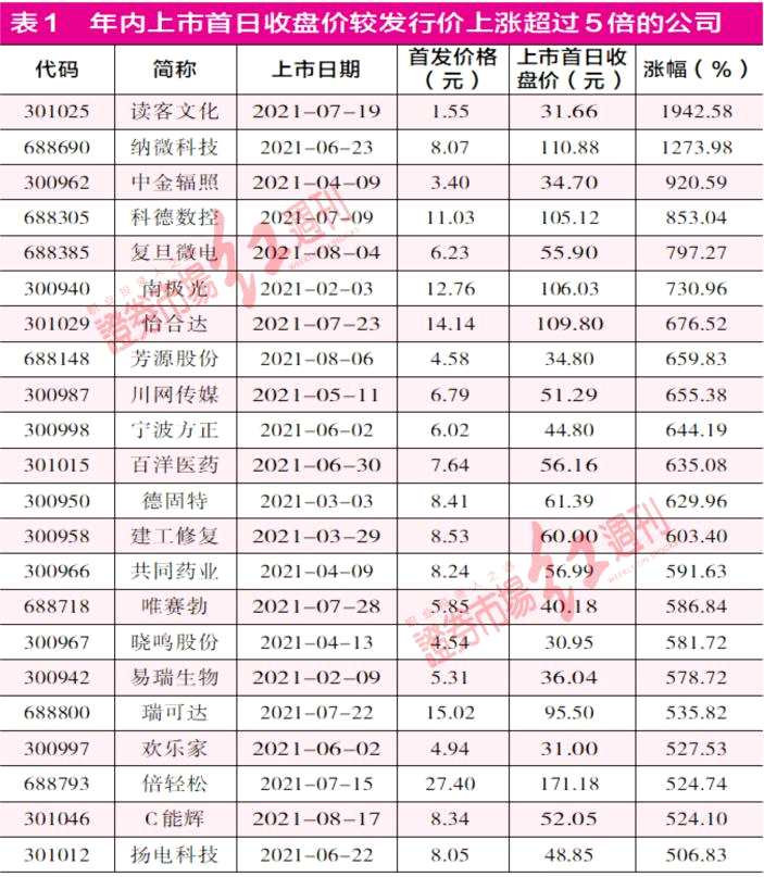 其實(shí),不僅僅是科創(chuàng)板公司存在低價(jià)發(fā)行情況,即使是創(chuàng)業(yè)板甚至主板市場(chǎng)今年以來(lái)也相繼發(fā)生過(guò)超低價(jià)發(fā)行案例。在創(chuàng)業(yè)板公司【讀客文化(301025)、股吧】(301025)的詢價(jià)過(guò)程中,10096個(gè)配售對(duì)象中有655個(gè)報(bào)價(jià)1.55元,最終公司以此定價(jià)。7月19日上市首日,公司股價(jià)報(bào)收于31.66元,漲幅高達(dá)1942.58%,若中一簽,上市首日就可獲得1.51萬(wàn)元的浮盈。