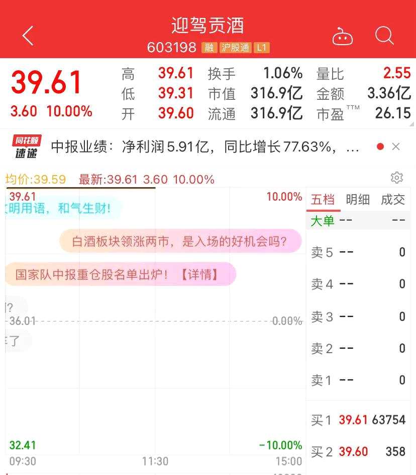 中報(bào)業(yè)績(jī)好的迎駕貢酒(603198),今日上午強(qiáng)勢(shì)漲停。