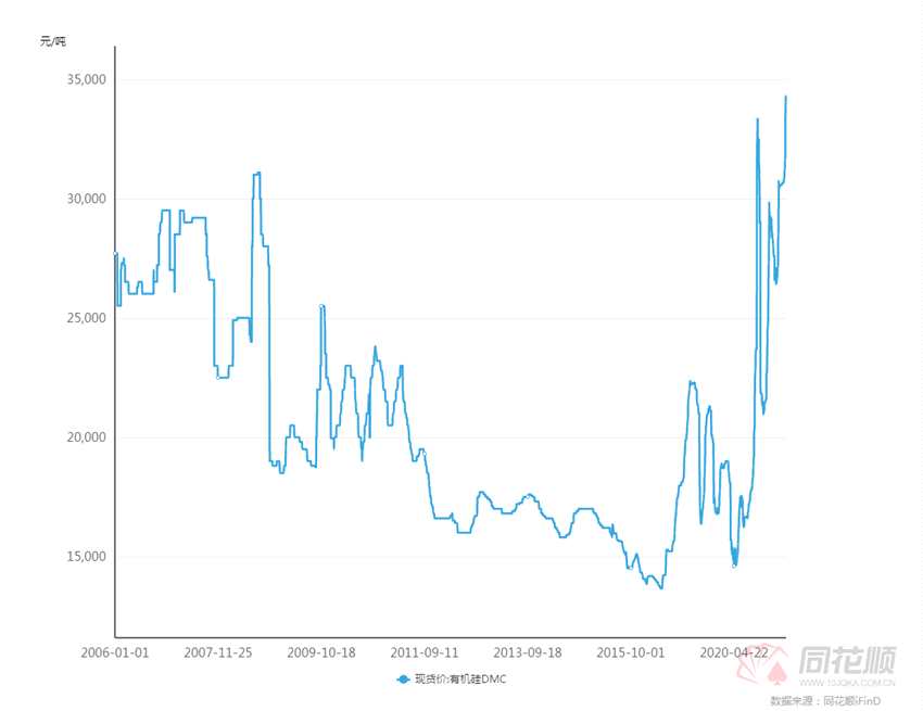 有機硅價格具有明顯周期屬性,從19年開始有機硅價格經(jīng)歷了2年的調(diào)整期,從2020年5月見底后開啟新一輪上漲行情。目前有機硅價格相比去年低位時1.5萬元左右的價格已實現(xiàn)翻倍上漲,且處于歷史高位附近,短期仍有望繼續(xù)維持強勢。