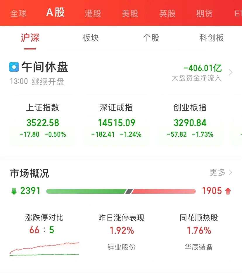 上午開盤后,市場一路走低,上午收盤上證指數(shù)跌0.5%,深證成指跌1.24%,創(chuàng)業(yè)板指數(shù)跌1.73%,科創(chuàng)50指數(shù)大跌2.16%,兩市成交額8685億元,個股1905個上漲,2391只下跌。