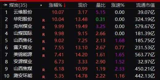 煤炭股當中,云維股份(600725)、華陽股份(600348)、兗州煤業(yè)(600188)、【山煤國際(600546)、股吧】(600546)等漲停,山西焦化(600740)、露天煤業(yè)(002128)等也大漲。