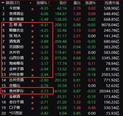 A股市值一哥,2萬億市值的貴州茅臺(600519)股價下跌2.73%,五糧液(000858)跌超4%,瀘州老窖(000568)下跌近3%。