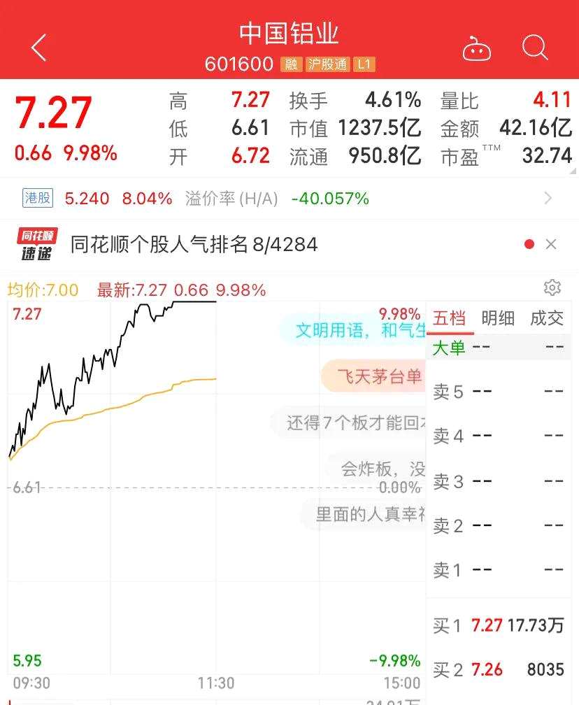 有色股當中,更有【中飛股份(300489)、股吧】(300489)、宏達股份(600331)、鋅業(yè)股份(000751)、錫業(yè)股份(000960)、株冶集團(600961)等10余漲停,千億級的”鋁茅“中國鋁業(yè)(601600)也漲停。
