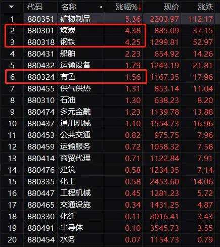 煤炭、鋼鐵行業(yè)漲幅超4%,有色石油等漲超1%。
