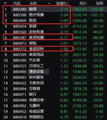 本已羸弱的白酒股,又遭遇2萬億市值巨頭茅臺酒價下跌的消息,今日上午再度重挫,釀酒股跌幅位居各行業(yè)前列,跌超3%。醫(yī)療、食品飲料、家電等大消費類板塊,成為下跌重災區(qū)。
