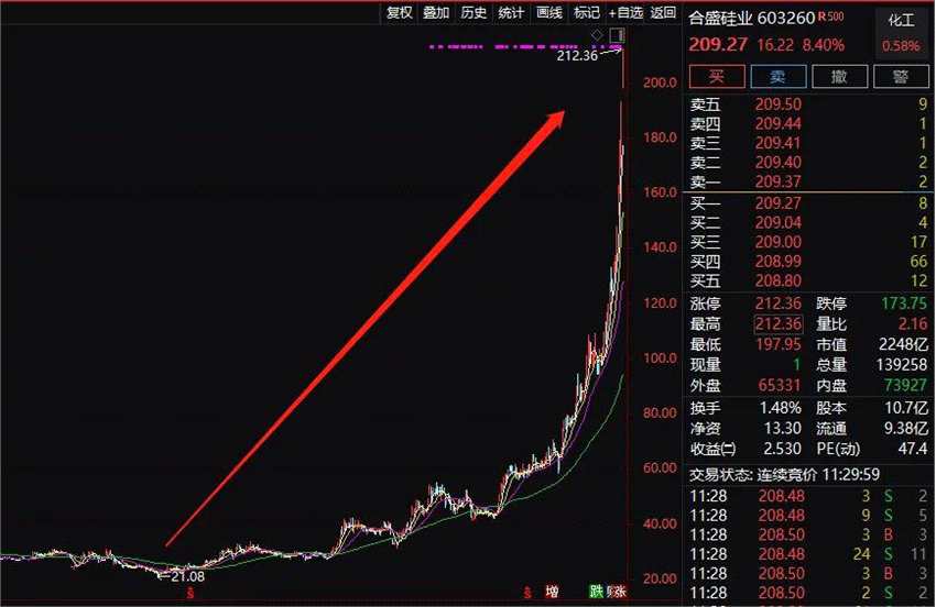 市值已經(jīng)漲到2000多億的有機硅龍頭,【合盛硅業(yè)(603260)、股吧】(603260)今天上午盤中再度漲停,股價直線攀升,從去年4月股價底部21.08元,至今股價已是10倍。